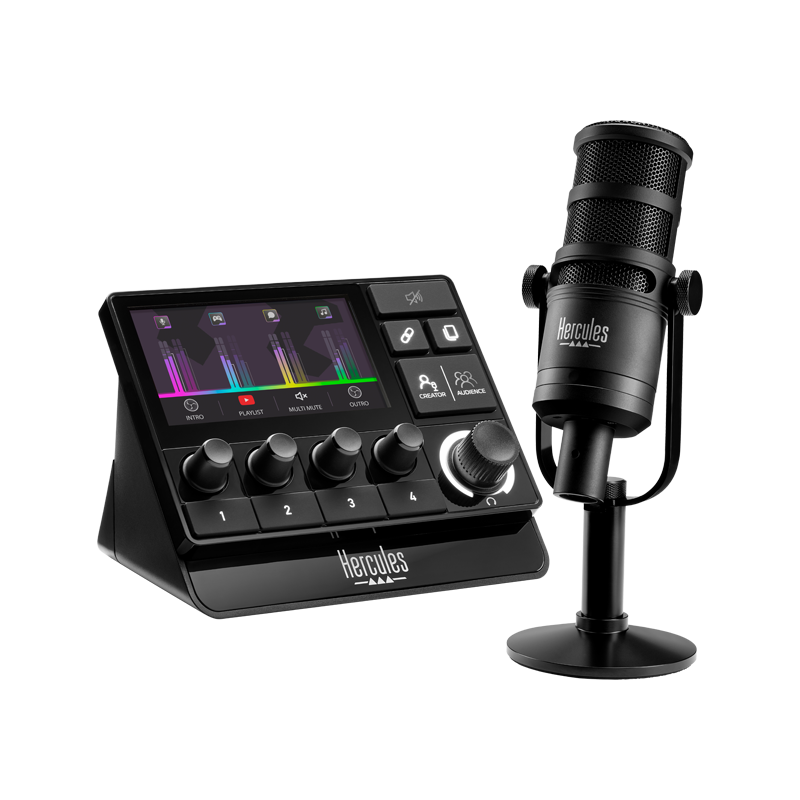 Das Hercules Stream Essentials Kit bietet das beste Bundle, wenn Sie ein XLR-Audio-Gaming-Setup wünschen. Der Hercules Stream 200 XLR und das neue Hercules XLR-Mikrofon, das HXD-700, bieten Ihnen alles, was Sie brauchen, um einen klaren und hochwertigen Sound zu kontrollieren und zu übertragen. Der Hercules Stream 200 XLR ist ein Audiocontroller mit einer eingebauten Soundkarte, die es Streamern ermöglicht, den Audiomix, den sie hören, von dem Mix zu trennen, der für ihr Publikum wiedergegeben wird.
