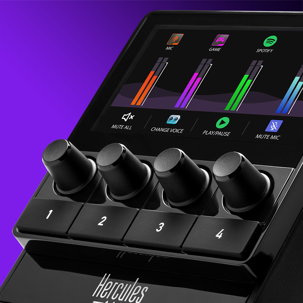 Hercules Stream 100 is an easy-to-use and effective gaming audio controller that lets you stop worrying about audio settings and react quickly during your games. Thanks to this audio controller with a built-in LCD screen, you can manage all your audio sources in real time: games, chat software, music, USB microphone, and more.Hercules Stream 100 lets you individually view and control the sound level of each audio track directly onscreen. Instantly enable, turn down, turn up, mute or unmute your sound!